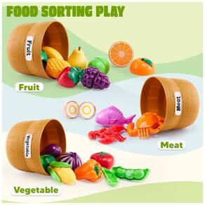 Jogo de Categorização: Inclui 3 tipos de alimentos simulados (carnes, vegetais e frutas) com etiquetas de identificação, promovendo o entendimento das categorias alimentares.