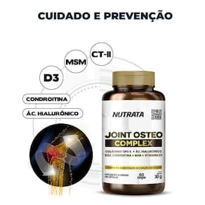 Descrição:O Joint Osteo Complex é um suplemento à base de colágeno tipo II derivado do frango em associação com ácido hialurônico, MSM, condroitina e vitamina D3. Sua formulação completa e balanceada fornece nutrientes para a saúde óssea e articular.Quando ingerir o Joint Osteo ComplexA partir de 25 anos de idade, há uma redução natural na produção de colágeno pelo organismo. Com uma suplementação adequada é possível reparar e prevenir danos causados por essa perda, promovendo a manutenção da saúde das articulações.Diferenciais:- Com MSM;- Com Condroitina;- Com Vitamina D3;- Com Ácido hialurônico;- 40mg de colágeno tipo II não desnaturado;- Auxilia na manutenção da função articular.Ingredientes:MSM metil sulfonil metano , sulfato de condroitina, hialuronato de sódio obtido pela fermentação de Streptococcus zoopidemicus, colágeno de frango com colágeno tipo 2 não desnaturado, aromatizante cúrcuma em pó, vitamina D3 colecalciferol , estabilizante amido, antiumectante dióxido de silício, cápsula: opacificante dióxido de titânio, gelatina e umectante glicerina . NÃO CONTÉM GLÚTEN.Sugestão de uso:Ingerir duas cápsulas ao dia ou conforme orientação de nutricionista ou médico.Conservação:Conservar o produto bem fechado, em local fresco, seco e ao abrigo de luz. Após aberto, consumir preferencialmente em até 60 dias.
