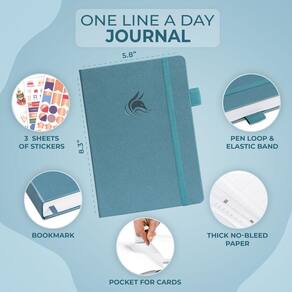 - Papel grosso e adesivos – Este diário diário para mulheres e homens mede 14,7 x 21 cm. O diário diário tem uma capa dura de couro ecológico, papel grosso de 120 g/m², faixa elástica, laço para caneta, encadernação plana e adesivos.