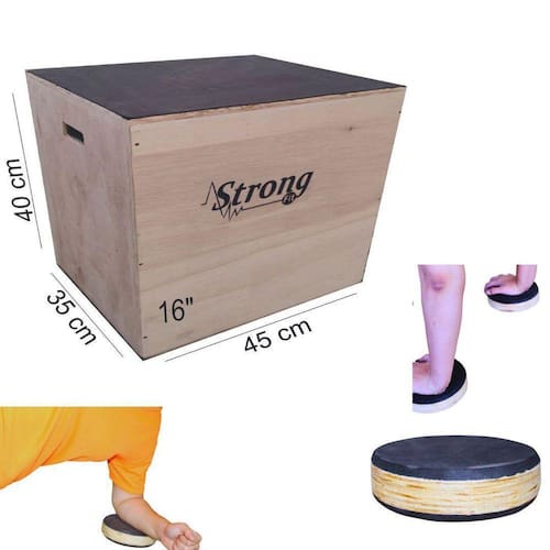 Kit caixa de salto/jump box 16' + disco yoga pilates Kit de exercícios funcional Medidas jump box 12'40cm altura x 35cm largura x 45cm comprimentoSuporte até 150 kgPode ser utilizada em todos os lados O disco yoga pilates traz mais estabilidade e conforto.