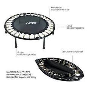 Descrição & Detalhes Características: O Trampolim Jump E9 da Acte Sports oferece uma estrutura resistente, suportando até 150KG. Com 36 molas, proporciona firmeza e segurança durante o exercício, ideal para quem busca tonificar a musculatura e melhorar o equilíbrio em atividades de alto gasto calórico. Recursos: Este trampolim é equipado com uma lona antiderrapante e pés com borrachas que garantem a estabilidade do produto durante o uso. Além disso, seus seis pés são soldados à estrutura, aumentando a durabilidade e resistência, tornando-o ideal para exercícios intensos. Design: Seu design compacto e resistente com medidas de 97cm de diâmetro e 17cm de altura, permite que o Trampolim Jump E9 seja utilizado em diversos ambientes, como academias, estúdios ou até em casa, proporcionando flexibilidade e comodidade no seu uso. Especificações: Feito em aço e lona, este trampolim suporta até 150KG. Suas 36 molas oferecem alta elasticidade, enquanto os pés antiderrapantes mantêm o produto fixo no chão durante os exercícios. Ideal para promover perda de gordura e aumento de resistência física. Uso: O Trampolim Jump E9 é indicado para quem deseja realizar exercícios aeróbicos de maneira divertida e eficaz. Ajuda a melhorar a capacidade cardiorrespiratória, fortalece a musculatura e promove alto gasto calórico, além de trabalhar o equilíbrio corporal. Características Gerais: Lona antiderrapante 36 molas resistentes 6 pés de sustentação com borrachas antiderrapantes Estrutura de aço super-resistente Suporta até 150KG : 6 meses 180 dias Marca: Não Informado Ean: 6920494800082
