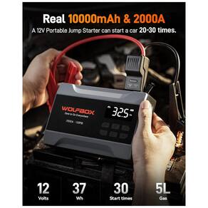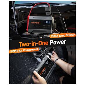 O WOLFBOX é um jump starter portátil com compressor integrado e capacidade de 37Wh, projetado para partida de veículos 12V com motores a gasolina até 5 L, fornecendo corrente de pico de 2000A. Inclui modo BOOST para baterias de baixa voltagem, proteções contra curto-circuito, inversão de polaridade e sobrecarga, além de cabos jumper inteligentes. O compressor atinge 150 PSI com manômetro digital e auto-shutoff, compatível com pneus de carros pequenos, motos e acessórios esportivos. Possui luzes LED multifuncionais e saídas USB para carregamento de dispositivos. Armazene entre 0°C e 40°C em local seco; recarregue a cada 3 meses se ocioso e evite exposição direta à água.