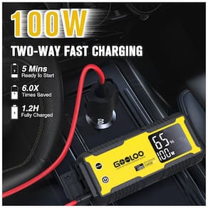 O Jump Starter GOOLOO GT4000S entrega corrente de pico de 4000A, permitindo partida de motores 12V de veículos em poucos segundos, com até 60 utilizações por carga completa. Suporta motores a gasolina de até 12,0 L e diesel de até 10,0 L, compatível com RVs, picapes, motocicletas, SUVs, tratores e barcos. Recarga ultrarrápida de 100W completa em 1,2 hora, com 5 minutos de carga suficientes para uma partida; inclui carregador veicular 100W e porta Type-C para carregadores PD.
