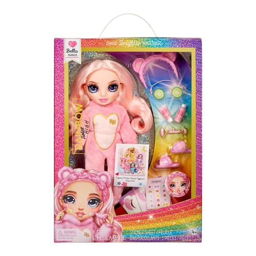 A boneca Rainbow High Jr High PJ Party – com macacão rosa e chinelos combinando Ela possui cabelo longo e encaracolado, olhos de vidro e rosto com traços infantis Totalmente posável, permite diversas poses, incluindo abertura de pernas Seu tema de festa do pijama é spa, com acessórios como máscara de pepino, adesivos para espinhas, rolo facial, máscaras para os olhos, sabonete facial e faixa de cabelo com orelhas fofas Ideal para crianças de 4 a 12 anos, também pode ser combinada com a versão mais velha de Bella, de 11, como irmã mais nova