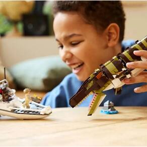 Boneco de ação de dinossauro e muito mais Um boneco de Mosasaurus construído em blocos com corpo articulado, um veículo de barco de brinquedo com rastreador de dinossauro, além de minifiguras de LeClerc e Atwater para inspirar a dramatização