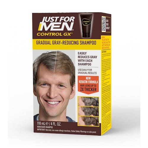 Experimente o Shampoo Redutor de Cinzas Just for Men Control GX, ideal para cabelos claros, de loiro a castanho médio. Este shampoo inovador oferece uma coloração gradual que reduz os fios grisalhos a cada lavagem, proporcionando resultados sutis e naturais, sem os efeitos agressivos de outras tinturas. Com uma fórmula tripla patenteada, ele não só limpa gentilmente, mas também revitaliza o cabelo, aumentando o volume para um visual mais espesso e cheio.
