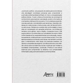 Juventude e política: uma proposta de análise geracional oferece uma abordagem sociológica perspicaz para compreender a juventude contemporânea do Brasil, em meio a uma polarização política intensa. O autor utiliza as ferramentas da sociologia do conhecimento para explorar a percepção social e a formação de orientações coletivas entre os jovens. O livro analisa as experiências da juventude, considerando suas narrativas, inserções cotidianas em redes sociais e institucionais, além de fatores histórico-estruturais. Destaca-se a análise das continuidades e inovações em comparação com gerações anteriores, com ênfase em variáveis como gênero, raça e religião. A pesquisa incluiu 2.169 questionários e 44 entrevistas com estudantes do ensino médio no Rio Grande do Sul, explorando temas como educação, resposta à pandemia, visões políticas e uso de mídias sociais. O livro não apenas esclarece a condição juvenil atual, mas também contribui para o entendimento mais amplo da juventude brasileira. Ao oferecer uma análise abrangente, convida os leitores a uma reflexão crítica sobre as dinâmicas sociais e políticas que moldam a sociedade contemporânea. Juventude e Política é uma leitura essencial para compreender os desafios e as complexidades enfrentados pela juventude brasileira contemporânea.