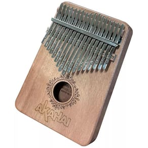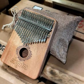 As chaves de metal da Muspor Kalimba são montadas em uma caixa de madeira sólida que funciona como uma câmara de ressonância.