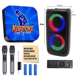 BENEFÍCIOS: - Música Ambiente Para sua festa não parar - Digite o Número Da Música e Cante Procure pela música desejada no Catálogo, digite no Karaokê, aperte OK no controle remoto e cante - Contagem Regressiva de 5 Segundos Personalizada Após selecionar a música - Lista De Espera Você pode adicionar até 5 músicas na lista de espera - Pontuação Após cantar receberá sua nota - Adicione Músicas Caso não tenha a música que deseja, você mesmo a poderá adicionar ÍTENS INCLUSOS: - 1 Karaokê Party Box - 1 Caixa de Som pequena 30cm altura + 15cm largura + 15cm espessura 200w potência, 20w subwoofer Com Bluetooth, função rádio, entrada usb, cartão sd e auxiliar p2 - 2 Microfones Sem Fio Com - 1 Controle Remoto - 1 Cabo HDMI - 1 Fonte Bivolt 110v/220v - 1 Cabo de áudio - 1 Pendrive - 1 Catálogo de Músicas Impresso DÚVIDAS FREQUENTES: Tem pontuação R: Sim, fictícia. É possível adicionar músicas R: Sim. Qual a voltagem R: Bivolt 110v/220v R: 3 meses. Precisa de Internet R: Não. Compatibilidade Funciona em Tv, monitor e projetor basta conectar na entrada hdmi OBS: Após a compra passaremos nosso contato e daremos todo suporte necessário Homologação Anatel: 112572013224 Marca: Não Informado Ean: 7894478300259