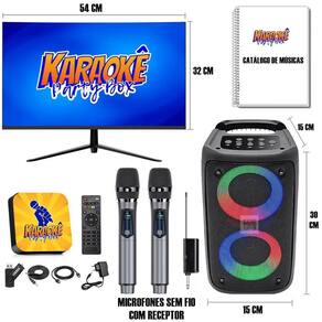 BENEFÍCIOS: - Música Ambiente Para sua festa não parar - Digite o Número Da Música e Cante Procure pela música desejada no Catálogo, digite no Karaokê, aperte OK no controle remoto e cante - Contagem Regressiva de 5 Segundos Personalizada Após selecionar a música - Lista De Espera Você pode adicionar até 5 músicas na lista de espera - Pontuação Após cantar receberá sua nota - Adicione Músicas Caso não tenha a música que deseja, você mesmo a poderá adicionar ÍTENS INCLUSOS: - 1 Karaokê Party Box - 1 Monitor Tela de 22 HD - 1 Caixa de Som 30cm altura + 15cm largura + 15cm espessura - 2 Microfones Sem Fio Com Rceptor - 1 Controle Remoto - 1 Cabo HDMI - 1 Fonte Bivolt 110v/220v - 1 Cabo de áudio - 1 Pendrive - 1 Catálogo de Músicas Impresso DÚVIDAS FREQUENTES: Tem pontuação R: Sim. É possível adicionar músicas R: Sim. Qual a voltagem R: Bivolt 110v/220v R: 3 meses. Precisa de Internet R: Não. OBS: Após a compra passaremos nosso contato e daremos todo suporte necessário. Homologação Anatel: 112572013224 Marca: Não Informado