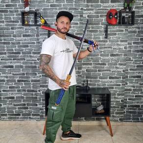 Katana Oni Skin Do Jogo Valorant Azul Tamanho Real Em Aço Katana Onimaru Kunitsuna Valorant Azul em Aço Inspirada na icônica Onimaru Kunitsuna de Valorant, esta katana combina elegância e autenticidade. Sua lâmina de aço pintado em tom branco oferece um visual sofisticado, enquanto a bainha de madeira detalhada e o cabo revestido em material sintético garantem estilo e conforto no manuseio. Com um design imponente e equilibrado, é ideal para colecionadores, cosplayers e fãs do jogo. Uma peça essencial para quem aprecia cultura samurai e lendárias dos games. Características: Material da lâmina: Aço pintado Bainha: Madeira detalhada com pintura e tiras de material sintético Cabo: Madeira revestida de material sintético Comprimento total: 110 cm Comprimento da espada: 100 cm Comprimento da lâmina: 64 cm Espessura da lâmina: 4 mm Comprimento do cabo: 36 cm Peso: 1350g Uso e Cuidados: Ideal para colecionadores, cosplayers e decoração temática. Para manter a integridade da lâmina, evite impactos e umidade excessiva. Armazene em local seco e arejado para preservar os detalhes da pintura e do revestimento do cabo. Para limpeza, utilize um pano seco ou levemente umedecido, sem produtos químicos abrasivos. Marca: Não Informado