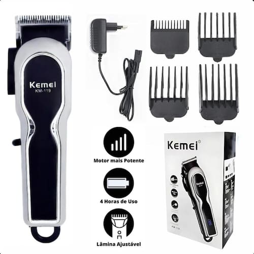 Kemei km-119 cortador digital sem fio Descrição do anúncio: Conteúdo da embalagem: 1 máquina de cortar cabelo kemei km-119 4 pentes de tamanhos variados 1mm, 2mm, 3mm e 4mm 1 cabo de carregamento 1 escova de limpeza 1 óleo lubrificante Características: 4 pentes de tamanhos variados: para atender a todas as necessidades de estilo e comprimento de cabelo. Corte preciso e uniforme: lâminas afiadas de cromo chapeado para um corte suave e sem falhas. Uso flexível: pode ser Utilizado com ou sem fio, oferecendo mais praticidade. Tempo de uso prolongado: até 240 minutos de uso contínuo após carregamento completo. Design ergonômico: facilita o manuseio e proporciona conforto durante o uso. Especificações: Marca: kemei Modelo: km-119 Material da lâmina: cromo chapeado de aço Tamanho do produto: 180 x 45 mm Peso líquido: 0.72 kg Cor do produto: prata Voltagem: bivolt 110v-220v Tensão do motor: 3.7 v Potência do corpo: 1w Tipo de : de impulso Velocidade do motor: 6800 rpm Método de uso: recarregável/usar direto na tomada Indicador led: sim Capacidade da bateria: 2600mah Tempo de carregamento: cerca de 3 horas Tempo de uso: cerca de 60 min Uso indicado: para todas as pessoas Principais perguntas sobre o produto e respostas: 1 qual é a autonomia da máquina após a carga completa A kemei km-119 oferece até 240 minutos de uso contínuo após o carregamento completo. 2 a máquina é adequada para uso doméstico e Sim, a kemei km-119 é projetada para oferecer cortes de alta qualidade, tanto para uso doméstico quanto . 3 a máquina pode ser Utilizado sem fio Sim, a kemei km-119 pode ser Utilizado com ou sem fio, proporcionando flexibilidade de uso. 4 quais são os tamanhos dos pentes incluídos O produto vem com pentes de 3mm, 6mm, 10mm e 13mm, atendendo a diferentes necessidades de estilo e comprimento de cabelo. 5 como faço para manter a máquina em boas condições É recomendável manter a máquina em um ambiente seco e aplicar regularmente o óleo lubrificante nas lâminas. Além disso, use a escova de limpeza inclusa para remover resíduos após o uso. Marca: Não Informado