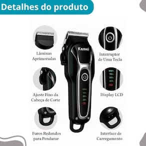Kemei km-1991 cortador potente e compacto Descrição do anúncio: A máquina de tosa pet bivolt kemei km-1991 é ideal para tosar animais de pequeno e médio porte de forma eficaz e segura. Equipada com lâmina de aço inoxidável, possui tela lcd digital para monitorar a bateria e opera silenciosamente, garantindo conforto para o pet. Conteúdo da embalagem: Máquina km-1991 Fonte bivolt 4 pentes guia 3mm, 6mm, 10mm, 13mm Bisnaga com silicone Pente Cortador de unhas Lixa Manual do usuário Características: Sem fio Tensão bivolt Potência de 5w Lâminas de aço inoxidável ajustáveis 0,5 mm a 1,0 mm Motor de alta velocidade Carregamento rápido 3 horas Autonomia de até 120 minutos 4 pentes guia 3mm, 6mm, 10mm, 13mm Especificações: Material: abs de alta qualidade Tela lcd Sistema de corte r-shape Tempo de carregamento: 3 horas Tempo de uso: até 120 minutos Tensão de entrada: 5v Corrente: 1000ma Principais perguntas sobre o produto e respostas: 1 é indicada para pets de médio e grande porte Sim, eficaz para animais de qualquer tamanho. 2 o produto é resistente Sim, feito com materiais de alta qualidade e durabilidade. 3 tempo de carregamento da bateria Aproximadamente 3 horas.