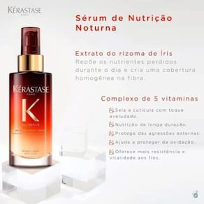 Este sérum de nutrição noturna para cabelos ressecados a severamente ressecados é profundamente absorvido pelas fibras capilares ao longo das 8 horas de sono para nutrir intensamente os fios enquanto você dorme. Com a tecnologia de Extrato de Rizoma de Iris e 5 vitaminas.