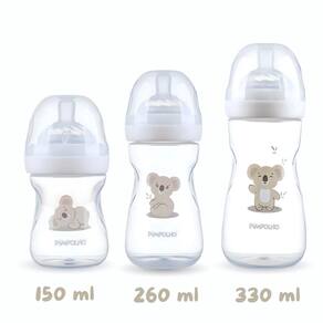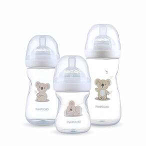 O kit é composto por 3 mamadeiras, uma de 150ml, uma de 220ml e uma de 330ml.