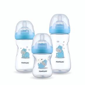 O kit é composto por 3 mamadeiras, uma de 150ml, uma de 220ml e uma de 330ml.