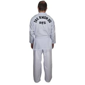 Confeccionado em 100% Poliéster, silk nas costas escrito Taekwondo em Português e Coreano.