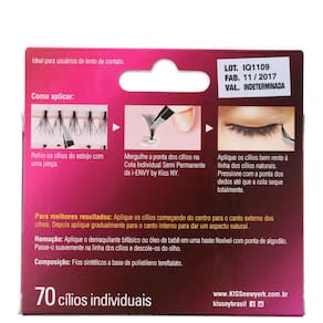 Cílios Curto sem Nó Kiss New York possui 70 tufos de fios sintéticos e comprimento curto. Com formato flare, é mais aberto na ponta para proporcionar olhar muito feminino e clássico, perfeito para quaisquer looks e ocasiões.