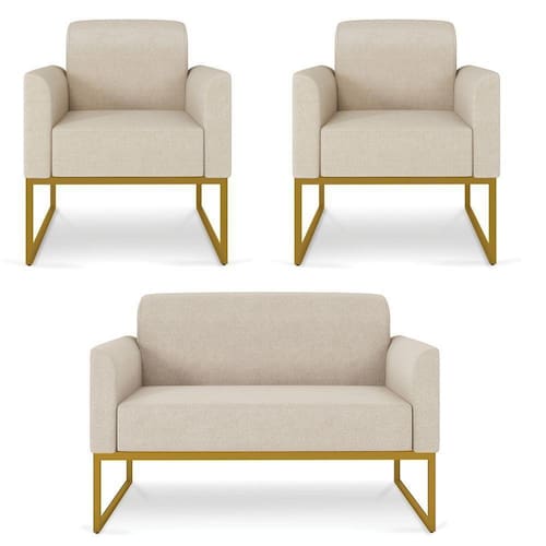 Apresentamos para você o Kit 01 Namoradeira e 02 Poltronas Marisa, que vai encher seu ambiente de cor e modernidade! Seu design feito com linhas retas proporciona conforto ao sentar-se sem falar em seus detalhes no assento e no encosto, um luxo! Sua estrutura robusta é confeccionada em madeira de eucalipto proveniente de reflorestamento, o estofamento do assento é composto de espuma prorelax D-23 no encosto e revestido em tecido Linho, sua sustentação é dada por uma base industrial metálica, suportando em média até 240 Kg a Namoradeira e 120 Kg cada Poltrona.