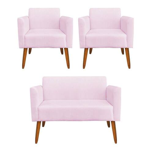 Kit 01 Namoradeira e 02 Poltronas Marisa Suede Rosa Bebê Pés Palito Castanho D'Rossi