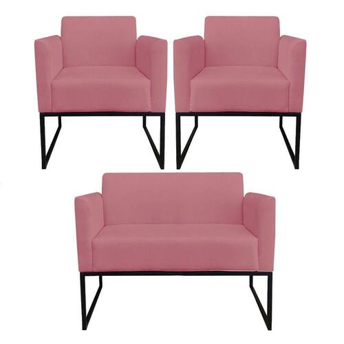 Kit 01 Namoradeira e 02 Poltronas Marisa Suede Rose Base Industrial Metálica Preto D'Rossi