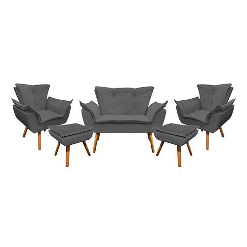 Se você estiver a procura de conforto para leitura e momentos de descanso, a Namoradeira, a Poltrona Opala e o Puff Opala é a sua melhor escolha. Com estilo inovador e moderno elas são um empoderamento visual. O seu interior é estruturado em madeira reflorestada de eucalipto e sua base é de MDF reforçada, com pés de madeira castanhos, que dão o apoio necessário para suportar até 120 kg na Poltrona, 80 kg no Puff e 120 kg em cada assento da Namoradeira. O encosto e o assento são fixos e utilizamos a espuma Prorelax D-23. Dimensões Namoradeira Altura total: 91 cm Largura total: 128 cm Profundidade total: 62 cm Altura do encosto: 48 cm Largura do assento: 88 cm Profundidade do assento: 46 cm Altura do chão ao assento: 47 cm Espessura do assento: 17 cm Tamanho dos pés: 30 cm Altura do chão ao braço: 65 cm Altura interna do braço: 18 cm Espessura do braço: 20 cm Peso: 22 kg Poltrona: Altura total: 91 cm Largura total: 80 cm Profundidade total: 67 cm Altura do encosto: 46 cm Largura do assento: 40 cm Profundidade do assento: 46 cm Altura do chão ao assento: 46 cm Espessura do assento: 16 cm Tamanho dos pés: 30 cm Altura do chão ao braço: 63 cm Altura interna do braço: 23 cm Espessura do braço: 20 cm Peso: 14 kg Puff: Altura: 45 cm Largura: 50 cm Profundidade: 40 cm Espessura do assento: 15 cm Tamanho dos pés: 30 cm Peso: 5 kg Especificações dos Produtos Estrutura: Madeira Eucalipto; Espuma: Prorelax D-23; Tecido: Corino; Tipo de pés: Pés palito; Peso Suportado: Namoradeira até 120 Kg por assento Poltrona até 120 Kg e Puff até 80kg; Garantia: 90 dias contra defeito de fabricação; Montagem: O produto vai montado, apenas rosquear os pés; Instruções de Limpeza: Utilizar um pano limpo e levemente úmido; Você irá receber: 02 volumes com 01 Namoradeira; 01 Poltrona e 01 Puff; Observações Relevantes - Todos os produtos vão embalados com total segurança; - As cores dos produtos podem sofrer alterações dependendo do seu monitor; - Para futuras compras, não garantimos a mesma tonalidade de cor, pois existe variação a cada lote do fabricante do tecido; - As imagens são meramente ilustrativas, não acompanham objetos de decoração e eletros; - Confira as dimensões do produto no momento da compra e certifique-se de que passará normalmente por escadas, elevadores, portas e corredores; - Importante: Por se tratar de estofado as medidas podem ter uma pequena variação em até 3 cm; - Não nos responsabilizamos no ato da entrega por montagens, desmontagens, instalações de produtos; - Não nos responsabilizamos no ato da entrega por subir escadas, elevadores, nem utilização de guinchos ou equipamentos similares para acesso a pisos superiores em apartamentos; - A entrega do produto é realizada em todo território nacional, até onde as rodovias alcançam, entregas fluviais ou aéreas devem ser cotadas a parte; - Observando as orientações acima, evita-se futuros desagrados ou imprevistos com a entrega do produto. Havendo despesas adicionais, serão de responsabilidade do cliente;