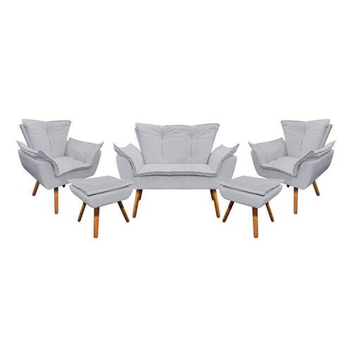 Se você estiver a procura de conforto para leitura e momentos de descanso, a Namoradeira, a Poltrona Opala e o Puff Opala é a sua melhor escolha. Com estilo inovador e moderno elas são um empoderamento visual. O seu interior é estruturado em madeira reflorestada de eucalipto e sua base é de MDF reforçada, com pés de madeira castanhos, que dão o apoio necessário para suportar até 120 kg na Poltrona, 80 kg no Puff e 120 kg em cada assento da Namoradeira. O encosto e o assento são fixos e utilizamos a espuma Prorelax D-23. Dimensões Namoradeira Altura total: 91 cm Largura total: 128 cm Profundidade total: 62 cm Altura do encosto: 48 cm Largura do assento: 88 cm Profundidade do assento: 46 cm Altura do chão ao assento: 47 cm Espessura do assento: 17 cm Tamanho dos pés: 30 cm Altura do chão ao braço: 65 cm Altura interna do braço: 18 cm Espessura do braço: 20 cm Peso: 22 kg Poltrona: Altura total: 91 cm Largura total: 80 cm Profundidade total: 67 cm Altura do encosto: 46 cm Largura do assento: 40 cm Profundidade do assento: 46 cm Altura do chão ao assento: 46 cm Espessura do assento: 16 cm Tamanho dos pés: 30 cm Altura do chão ao braço: 63 cm Altura interna do braço: 23 cm Espessura do braço: 20 cm Peso: 14 kg Puff: Altura: 45 cm Largura: 50 cm Profundidade: 40 cm Espessura do assento: 15 cm Tamanho dos pés: 30 cm Peso: 5 kg Especificações dos Produtos Estrutura: Madeira Eucalipto; Espuma: Prorelax D-23; Tecido: Corino; Tipo de pés: Pés palito; Peso Suportado: Namoradeira até 120 Kg por assento Poltrona até 120 Kg e Puff até 80kg; Garantia: 90 dias contra defeito de fabricação; Montagem: O produto vai montado, apenas rosquear os pés; Instruções de Limpeza: Utilizar um pano limpo e levemente úmido; Você irá receber: 02 volumes com 01 Namoradeira; 01 Poltrona e 01 Puff; Observações Relevantes - Todos os produtos vão embalados com total segurança; - As cores dos produtos podem sofrer alterações dependendo do seu monitor; - Para futuras compras, não garantimos a mesma tonalidade de cor, pois existe variação a cada lote do fabricante do tecido; - As imagens são meramente ilustrativas, não acompanham objetos de decoração e eletros; - Confira as dimensões do produto no momento da compra e certifique-se de que passará normalmente por escadas, elevadores, portas e corredores; - Importante: Por se tratar de estofado as medidas podem ter uma pequena variação em até 3 cm; - Não nos responsabilizamos no ato da entrega por montagens, desmontagens, instalações de produtos; - Não nos responsabilizamos no ato da entrega por subir escadas, elevadores, nem utilização de guinchos ou equipamentos similares para acesso a pisos superiores em apartamentos; - Observando as orientações acima, evita-se futuros desagrados ou imprevistos com a entrega do produto. Havendo despesas adicionais, serão de responsabilidade do cliente;
