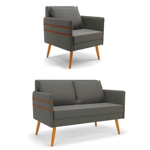 Que tal o kit Namoradeira e Poltrona Mari? Imagine-se utilizando esse kit e usufruindo de todos os benefícios que ele oferece. Pode ser utilizado para evidenciar e enriquecer o seu ambiente, descansar depois de um dia longo de trabalho, ver aquela série favorita ou simplesmente ler seu livro predileto. A estrutura deste conjunto é confeccionada em madeira de eucalipto proveniente de reflorestamento, suportando em média até 120 Kg, possuí pés palito castanho, garantindo uma maior resistência e durabilidade ao produto, o estofamento do assento e encosto é composto de espuma D-23, revestido em tecido Suede no tom Grafite. Então, se a sua dificuldade é a otimização de espaço, este Kit além de confortável e sofisticado, traz toda a funcionalidade que você precisa. Apenas alguns conjuntos estão disponíveis, separe o seu Kit 01 Namoradeira e 01 Poltrona Mari antes que acabem!
