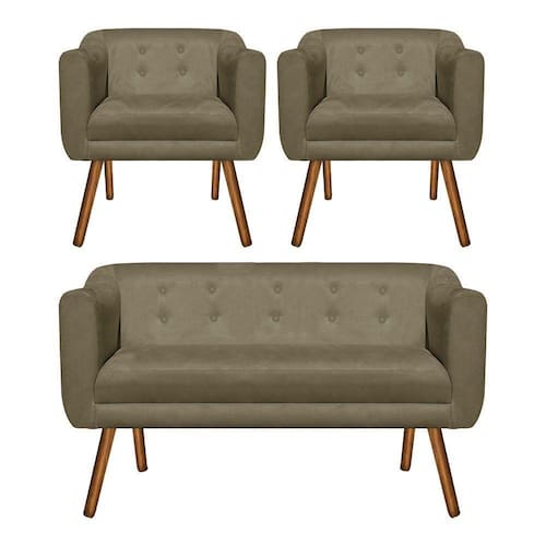 Que tal renovar o seu ambiente? O Kit Namoradeira com Poltrona Julia é cheia de personalidade, e trás estilo e elegância na decoração, ela vai te surpreender. Compacta e com um design incrível ela vai se adaptar perfeitamente em qualquer ambiente seja sua sala, quarto ou home office, você vai se apaixonar por esse conjunto. Com base em madeira ela remete a uma poltrona moderna, rica em curvas e detalhes no estilo botonê, com botões encapados. Com conforto e elegância na medida certa proporcionado pela estrutura de madeira de eucalipto proveniente de reflorestamento, espuma com densidade D-26 (encosto e no assento), revestimento de tecido linha alta, um charme! Dimensões Poltrona: Altura total: 81 cm Largura total: 71 cm Profundidade total: 59 cm Altura do encosto: 37 cm Largura do assento: 49 cm Profundidade do assento: 49 cm Altura do chão ao assento: 48 cm Espessura do assento: 18 cm Tamanho dos pés: 30 cm Altura do chão ao braço: 72 cm Altura interna do braço: 27 cm Espessura do braço: 12 cm Peso: 18 kg Namoradeira: Altura total: 82 cm Largura total: 118 cm Profundidade total: 62 cm Altura do encosto: 38 cm Largura do assento: 98 cm Profundidade do assento: 47 cm Altura do chão ao assento: 47 cm Espessura do assento: 17 cm Tamanho dos pés: 30 cm Altura do chão ao braço: 72 cm Altura interna do braço: 25 cm Espessura do braço: 10 cm Peso: 20 kg Especificações do Produto Estrutura: Madeira Eucalipto Espuma: D-26 Tecido: Suede (100% Poliéster) Tipo de pés: Pés palito Peso Suportado: Até 120 Kg por assento Garantia: 90 dias contra defeito de fabricação Montagem: O produto vai montado, apenas rosquear os pés e parafusar a base Instruções de Limpeza: Utilizar um pano limpo e levemente úmido Você irá receber: 02 volumes com 03 Produtos Observações Relevantes - Todos os produtos vão embalados com total segurança; - As cores dos produtos podem sofrer alterações dependendo do seu monitor; - Para futuras compras, não garantimos a mesma tonalidade de cor, pois existe variação a cada lote do fabricante do tecido; - As imagens são meramente ilustrativas, não acompanham objetos de decoração e eletros; - Confira as dimensões do produto no momento da compra e certifique-se de que passará normalmente por escadas, elevadores, portas e corredores; - Importante: Por se tratar de estofado as medidas podem ter uma pequena variação em até 3 cm; - Não nos responsabilizamos no ato da entrega por montagens, desmontagens, instalações de produtos; - Não nos responsabilizamos no ato da entrega por subir escadas, elevadores, nem utilização de guinchos ou equipamentos similares para acesso a pisos superiores em apartamentos; - Observando as orientações acima, evita-se futuros desagrados ou imprevistos com a entrega do produto. Havendo despesas adicionais, serão de responsabilidade do cliente;