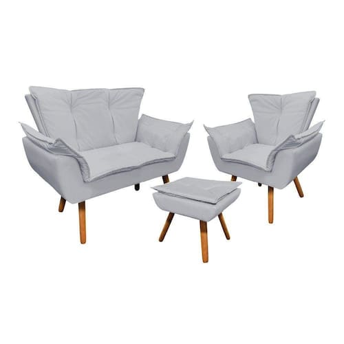 Se você estiver a procura de conforto para leitura e momentos de descanso, a Namoradeira, a Poltrona Opala e o Puff Opala é a sua melhor escolha. Com estilo inovador e moderno elas são um empoderamento visual. O seu interior é estruturado em madeira reflorestada de eucalipto e sua base é de MDF reforçada, com pés de madeira castanhos, que dão o apoio necessário para suportar até 120 kg na Poltrona, 80 kg no Puff e 120 kg em cada assento da Namoradeira. O encosto e o assento são fixos e utilizamos a espuma Prorelax D-23. Dimensões Namoradeira Altura total: 91 cm Largura total: 128 cm Profundidade total: 62 cm Altura do encosto: 48 cm Largura do assento: 88 cm Profundidade do assento: 46 cm Altura do chão ao assento: 47 cm Espessura do assento: 17 cm Tamanho dos pés: 30 cm Altura do chão ao braço: 65 cm Altura interna do braço: 18 cm Espessura do braço: 20 cm Peso: 22 kg Poltrona: Altura total: 91 cm Largura total: 80 cm Profundidade total: 67 cm Altura do encosto: 46 cm Largura do assento: 40 cm Profundidade do assento: 46 cm Altura do chão ao assento: 46 cm Espessura do assento: 16 cm Tamanho dos pés: 30 cm Altura do chão ao braço: 63 cm Altura interna do braço: 23 cm Espessura do braço: 20 cm Peso: 14 kg Puff: Altura: 45 cm Largura: 50 cm Profundidade: 40 cm Espessura do assento: 15 cm Tamanho dos pés: 30 cm Peso: 5 kg Especificações dos Produtos Estrutura: Madeira Eucalipto; Espuma: Prorelax D-23; Tecido: Corino; Tipo de pés: Pés palito; Peso Suportado: Namoradeira até 120 Kg por assento Poltrona até 120 Kg e Puff até 80kg; Garantia: 90 dias contra defeito de fabricação; Montagem: O produto vai montado, apenas rosquear os pés; Instruções de Limpeza: Utilizar um pano limpo e levemente úmido; Você irá receber: 02 volumes com 01 Namoradeira; 01 Poltrona e 01 Puff; Observações Relevantes - Todos os produtos vão embalados com total segurança; - As cores dos produtos podem sofrer alterações dependendo do seu monitor; - Para futuras compras, não garantimos a mesma tonalidade de cor, pois existe variação a cada lote do fabricante do tecido; - As imagens são meramente ilustrativas, não acompanham objetos de decoração e eletros; - Confira as dimensões do produto no momento da compra e certifique-se de que passará normalmente por escadas, elevadores, portas e corredores; - Importante: Por se tratar de estofado as medidas podem ter uma pequena variação em até 3 cm; - Não nos responsabilizamos no ato da entrega por montagens, desmontagens, instalações de produtos; - Não nos responsabilizamos no ato da entrega por subir escadas, elevadores, nem utilização de guinchos ou equipamentos similares para acesso a pisos superiores em apartamentos; - Observando as orientações acima, evita-se futuros desagrados ou imprevistos com a entrega do produto. Havendo despesas adicionais, serão de responsabilidade do cliente;