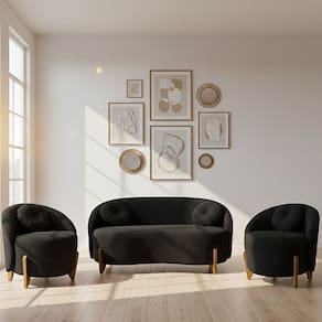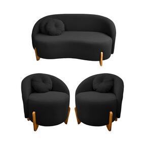 Kit 01 Sofá 2 Lugares + 02 Poltronas Orgânicos c/ Almofadas Curvo Sala Recepção Amsterdã Boucle Preto - Montanari`s Decor