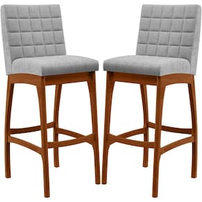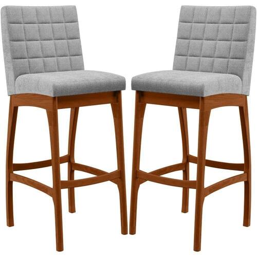 ndo muita excelência, o Kit 02 Banquetas Alta Para Cozinha Sala De Jantar Fixa Mila B04 Bouclê Cinza - Lyam Decor é o complemento que faltava para deixar sua casa ainda mais extraordinária. Seu encosto com costura em padrão quadriculado e assento estofados, centralizam em si uma graciosidade estonteante, sem perder todo o conforto, sendo revestidos pelo riquíssimo tecido em bouclê que por si só já é um espetáculo. A estrutura em madeira, na cor nozes, também é digna de notoriedade, por imprimir bastante personalidade a sua decoração. Vale ressaltar ainda, o apoio para os pés que garante maior segurança à mesma.