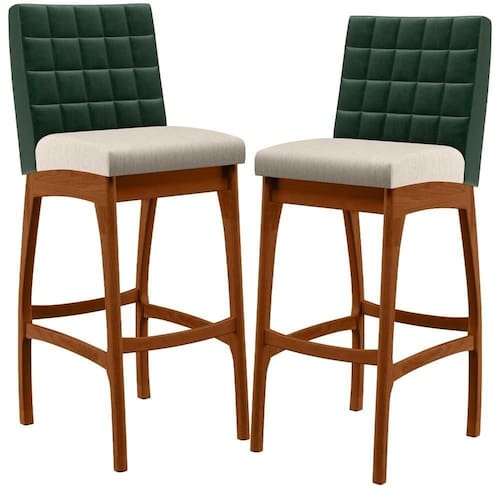 ndo muita excelência, o Kit 02 Banquetas Altas Cozinha Sala De Jantar Fixa Mila B04 Facto Verde Musgo Linho Cru - Lyam Decor é o complemento que faltava para deixar sua casa ainda mais extraordinária. Seu encosto com costura em padrão quadriculado e assento estofados, centralizam em si uma graciosidade estonteante, sem perder todo o conforto. A estrutura em madeira, na cor nozes, também é digna de notoriedade, por imprimir bastante personalidade a sua decoração. Vale ressaltar ainda, o apoio para os pés que garante maior segurança à banqueta.
