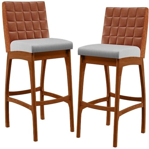 ndo muita excelência, o Kit 02 Banquetas Altas Cozinha Sala Jantar Fixa Mila B04 Couríssimo Camel Linho Cinza - Lyam Decor é o complemento que faltava para deixar sua casa ainda mais extraordinária. Seu encosto com costura em padrão quadriculado e assento estofados, centralizam em si uma graciosidade estonteante, sem perder todo o conforto. A estrutura em madeira, na cor nozes, também é digna de notoriedade, por imprimir bastante personalidade a sua decoração. Vale ressaltar ainda, o apoio para os pés que garante maior segurança à banqueta.