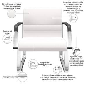 MaterialFamily: Vinil | Model: Lev | OriginCountry: | de registrocertificação INMETRO: ABNT NBR 13962, ABNT ABNT NM 300, NR 17 | OriginState: PR | Material do estofamento: Vinil | ProductHeight: 82 cm | Formato de venda: Kit | ColorFamily: Branco | ColorSimple: Branco | Com apoio de braços: Sim | Modelo detalhado: Lev com Braços Base Cromada | ColorSupplier: Branco | Cor: Branco | Modelo: Lev | Tipo de cadeira de escritório: Cadeira Recepção, Sala de Espera | Color: Branco | Material: Tubo de Aço Carbono, Espuma ível Poliuretano, Vinil | Com rodas: Não | Materiais do aro para pés: na | Com aro para pés: Não | Requer montagem: Sim | SupplierSimpleName: Kit 02 Cadeiras de Escritório Recepção Fixa Pés Cromado Lev P03 Vinil Branco - Lyam Decor | ProductLength: 66 cm | ProductInstructions: Produto para uso em ambiente interno, nao devendo ficar exposto ao sol, calor e umidade excessivos. | ProductContents: 02 Cadeiras, manual de instruções | ProductWeight: 30 kg | ProductWidth: 77 cm | ProductWarranty: 90 dias após o do produto | SizeDescription: Altura: 82 cm x Largura: 77 cm x Profundidade: 66 cm
