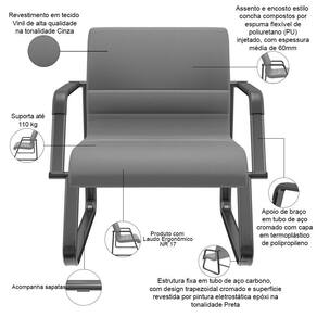 Model: Lev | ColorFamily: Cinza | Color: Cinza | ColorSupplier: Cinza | Modelo: Lev | Com apoio de braços: Sim | Modelo detalhado: Lev com Braços Base Preta | ProductWarranty: 90 dias após o do produto | SizeDescription: Altura: 82 cm x Largura: 77 cm x Profundidade: 66 cm | Cor: Cinza | Tipo de cadeira de escritório: Cadeira Recepção, Sala de Espera | ProductInstructions: Produto para uso em ambiente interno, nao devendo ficar exposto ao sol, calor e umidade excessivos. | ProductLength: 66 cm | MaterialFamily: Vinil | Materiais do aro para pés: na | SupplierSimpleName: Kit 02 Cadeiras de Escritório Recepção Fixa Pés Preto Lev P03 Vinil Cinza - Lyam Decor | ProductWeight: 30 kg | ColorSimple: Cinza | Material: Tubo de Aço Carbono, Espuma ível Poliuretano, Vinil | Com rodas: Não | Formato de venda: Kit | Com aro para pés: Não | Requer montagem: Sim | OriginCountry: | ProductWidth: 77 cm | ProductHeight: 82 cm | Material do estofamento: Vinil | ProductContents: 02 Cadeiras, manual de instruções | de registrocertificação INMETRO: ABNT NBR 13962, ABNT ABNT NM 300, NR 17 | OriginState: PR