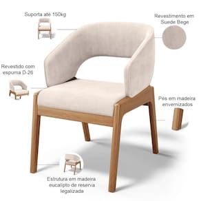 Adicione um toque de elegância à sua sala de jantar com a incrível Cadeira Estofada Lince . Reunir amigos e familiares em nosso lar é sempre prazeroso, assim como celebrar de momentos especiais merece sempre o melhor. O design dessa cadeira consta com encosto vazado, adicionando um elemento de estilo único e marcante para desfrutar confortavelmente por horas. Seu estofamento macio pode tornar qualquer ocasião inesquecível, sendo perfeita para jantares longos e reuniões com amigos e familiares. A Cadeira Lince é vestida de versatilidade e pode facilmente ser utilizada em diversos ambientes, como espaços comerciais, recepção de hotel e eventos, até como poltrona para sala de estar. Design ímpar e curvas suaves com ligação dos braços até o encosto, detalhes que irão elevar a sua decoração ao mais alto padrão. Dimensões do produto (L x A x P) 57 cm x 82 cm x 63 cm Medidas internas Altura do chão a base: 39 cm Altura do chão ao assento: 47 cm Largura do assento: 49 cm Profundidade do assento: 49 cm Altura do encosto: 22 cm Altura total do encosto: 39 cm Largura do encosto: 35 cm Peso aproximado: Aproximadamente 14 kg Características: Estrutura de Madeira de Eucalipto tratado de reserva legalizada, correto ecologicamente. Produto revestido com espuma D-26. Revestimento em Suede na cor Bege Pés em Madeira envernizados. Suporta até 150 kg por assento. - Por se tratar de estofado as medidas podem ter uma pequena variação de até 3 cm. - A tonalidade do produto real poderá ter ligeira variação devido o lote de tecidos. Observações importantes: - A montagem será de responsabilidade do comprador. - Responsabilizamo-nos pela entrega em todo território nacional, até onde as rodovias alcançam, entregas fluviais ou aéreas devem ser cotadas a parte. - As imagens são ilustrativas, não acompanham objetos de decoração e eletrônicos. - Não nos responsabilizamos, no ato da entrega, por subir escadas/elevadores ou transporte por guincho em apartamentos. - Eventuais despesas são de responsabilidade do comprador.