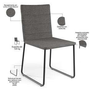 Color: Cinza | ColorFamily: Cinza | ColorSimple: Cinza | ColorSupplier: Cinza Escuro | Material: Estrutura em Madeira, Revestimento em Linho e espuma | MaterialFamily: Madeira, linho e espuma | Model: Maya | OriginCountry: Nacional | OriginState: PR | ProductContents: 02 Cadeiras | ProductHeight: 174 cm | ProductInstructions: Produto para uso em ambiente interno, nao devendo ficar exposto ao sol, calor e umidade excessivos. | ProductLength: 53 cm | ProductWarranty: 90 dias após o recebimento do produto | ProductWeight: 13,2 Kg | ProductWidth: 46 cm | SizeDescription: Altura: 174 cm x Largura: 46 cm x Profundidade: 53 cm | SupplierSimpleName: Kit 02 Cadeiras Decorativa Estofada Para Sala De Jantar Preto Maya L02 Linho Cinza Escuro - Lyam Dec