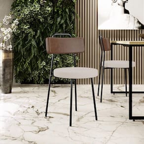 Revestimento do encosto em Couríssimo na cor Marrom e do assento em Linho na cor Bege, com acabamento semi brilho.