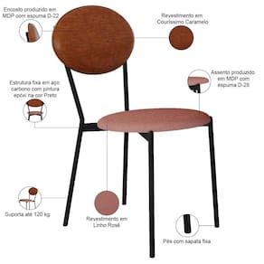 É dobrável: Não | ProductWidth: 43 cm | Cor da estrutura da cadeira: Preto | Profundidade do assento: 42 cm | Firmeza: Firme | ProductLength: 53 cm | ProductWarranty: 90 dias após o recebimento do produto | ProductHeight: 172 cm | ProductInstructions: Produto para uso em ambiente interno, nao devendo ficar exposto ao sol, calor e umidade excessivos. | Fabricante: Lyam Decor | Espessura do assento: na | Peso máximo suportado: 120 kg | Requer montagem: Não | ColorSupplier: Rosê, Caramelo | Cor do assento: Caramelo | É cadeira de balanço: Não | Material do estofamento: MDP, Espuma D22D28, Linho e Couro sintético | Color: Caramelo | Cor: Caramelo | Tempo de montagem: na | Largura da cadeira: 43 cm | ColorSimple: Caramelo | Cor do estofamento: RosêCaramelo | Material: Estrutura em Aço e MDP, Revestimento em Linho e Couro sintético | MaterialFamily: Aço, MDP, Linho e Couro sintético | Model: Azuri | OriginCountry: Brasil | OriginState: PR | ProductContents: 02 Cadeiras | SizeDescription: Altura: 172 cm x Largura: 43 cm x Profundidade: 53 cm | SupplierSimpleName: Kit 02 Cadeiras Estofada Para Sala de Jantar Azuri Preto C01 Linho Rosê Courino Caramelo - Lyam Deco | ProductWeight: 11 kg | Desenho do tecido: Liso | Altura da cadeira: 86 cm | Profundidade da cadeira: 53 cm | Largura do assento: NA | ColorFamily: Caramelo | Altura do assento a partir do solo: 49 cm | É empilhável: Não