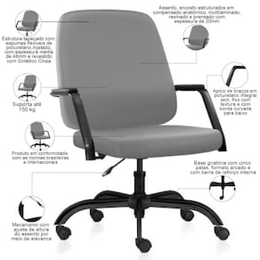 O assento e encosto anatômicos garantem um ajuste perfeito ao corpo, ao passo que proporcionam suporte e alívio para a coluna, mesmo durante longas jornadas de trabalho. Já a base giratória oferece maior estabilidade e segurança, permitindo que você se movimente livremente pela sua área de trabalho, para uma rotina mais dinâmica. Por fim, o design contemporâneo, com linhas modernas e elegantes, se adaptam a qualquer ambiente corporativo, complementando a decoração do seu escritório.