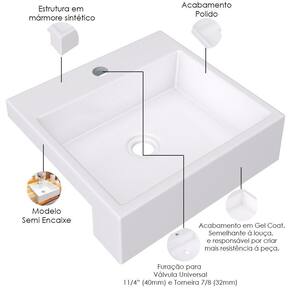 Estrutura em Mármore Sintético com acabamento Hard Lacca PU, semelhante a louça e responsável por criar mais resistência a peça. Acabamento Brilho. Furação da Cuba: Acabamento Torneira: 7/8 (32mm) - Válvula: 1 1/4 (40mm) Acabamento Polido. Formato: Quadrada. Modelo: Semi Encaixe.Importante: O produto é enviado montado, requerendo apenas instalação por parte do cliente.