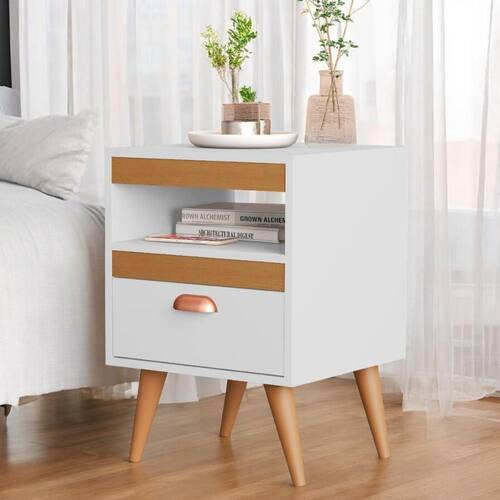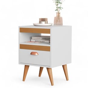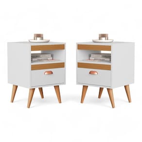 Cada mesa de cabeceira oferece espaço para seus itens essenciais, como livros, abajures e objetos, mantendo tudo ao seu alcance.