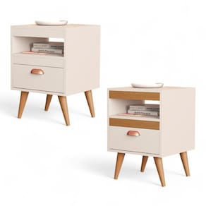 Cada mesa de cabeceira oferece espaço para seus itens essenciais, como livros, abajures e objetos, mantendo tudo ao seu alcance.