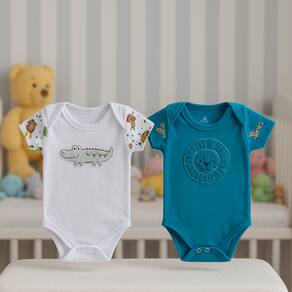 Kit 2 Body Bebê Manga Curta Estampado, este modelo proporciona suavidade e respirabilidade, ideal para o dia a dia e passeios. As mangas curtas garantem liberdade de movimento, enquanto a abertura superior e os abotoadores metálicos facilitam a troca e o vestir.