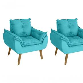 Kit 02 Poltrona/Cadeira Decorativa E Puff Glamour Com Pés Quadrado Azul Turquesa - Kit poltrona com Puff