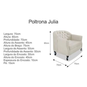 Gostaria de um móvel que trouxesse mais elegância e sofisticação para o seu lar? O Kit 02 Poltronas Julia A02 é sua melhor opção! Com característica moderna e com acabamento de qualidade, este produto atenderá suas expectativas! Não perca essa oportunidade e adquira já a sua!Especificações Técnicas do Kit 02 Poltronas Julia A02 : - Altura: 80 cm;- Largura Total: 69 cm;- Profundidade: 70 cm;- Peso: 20 Kg;- Peso Suportado: 120 Kg;Diferenciais do Kit 02 Poltronas Julia A02 : - Material da Estrutura: fabricado com Madeira Pinus e Eucalipto Reflorestada, e alguns detalhes em MDF;- Tipo de Assento: Estofado e com espuma de densidade D-26;- Tipo de Encosto: Estofado e com espuma de densidade D-18;- Detalhes do Pé: acompanham pés de madeira de alta resistência;Recomendações de limpeza: -Limpar com flanela limpa e seca. Não molhar o móvel e não expor em lugar úmido ou próximo de fontes de calor. Não usar produtos abrasivos.Observações Importantes: - As imagens ambientadas são meramente ilustrativas e podem apresentar itens que não compõe o produto;- Objetos decorativos que aparecem na foto não acompanham o produto;- As cores do produto podem variar de acordo com o monitor, a iluminação do ambiente, ou sua percepção visual;- O Kit 02 Poltronas Julia A02 chegará montado para você, bastando encaixar os pés;- Confira as dimensões antes da compra e certifique-se de que o produto passará por elevadores, portas e corredores;- Ao receber seus produtos, verifique no ato do recebimento qualquer dano na embalagem;- Produto para uso residencial em ambiente interno, não devendo ficar exposto diretamente ao sol, calor e umidades excessivas.