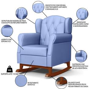 O Kit 02 Poltronas Amamentação Base Madeira Balanço Lucy P04 Sintético Azul Mpozenato é a escolha ideal para as mamães que buscam conforto, beleza e qualidade. Ela possui uma estrutura de madeira de reflorestamento com imunização contra mofo, cupim e microrganismos, garantindo maior durabilidade e resistência. A sustentação do assento e encosto é feita com percintas elásticas que proporcionam mais maciez e ergonomia. O Tecido Sintético é fácil de limpar e tem um toque suave na pele. A base canoa com balanço permite um movimento suave e relaxante, ideal para ninar o bebê ou descansar após um dia cansativo. A poltrona tem um design moderno e elegante que combina com qualquer ambiente. Ela está disponível em para você escolher a que mais combina com o seu estilo. Não perca essa oportunidade de ter uma Poltrona de Amamentação e Descanso na sua casa. Você vai se surpreender com o conforto e a qualidade dessa poltrona. Compre já!