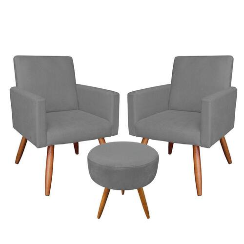 Chegou para vocês o Kit 02 Poltronas com 01 Puff Larissa! A Poltrona Larissa que além de versátil foi desenvolvida para deixar boas impressões! Com conforto e qualidade, possui um design simples que irá se adaptar em vários ambientes e decorá-los maravilhosamente. Já o Puff Larissa possui seu visual moderno, se adaptando facilmente aos cômodos deixando com que as pessoas se sintam confortáveis e elegantes ao sentar. Sua neutralidade permite que você tenha total liberdade para combinar com as cores que quiser, com objetos vintage ou modernos, assim criando um visual exclusivo e original. O seu interior é estruturado em madeira reflorestada de eucalipto e sua base é de MDF reforçada, com pés de madeira, já no encosto é utilizado no a espuma D-23, revestidos em um tecido de ótima qualidade. Ao escolher o Kit Larissa você permite ampliar mais o espaço onde for colocado, fazendo seu próprio estilo! Sendo feita a junção desses dois móveis, ficará incrível qualquer lugar em que escolher colocá-los! Não fique por fora dessa oportunidade única de ter o Kit Larissa em sua casa!