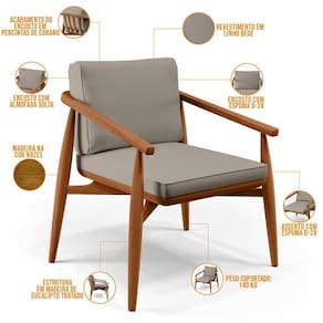 Com sua resistente estrutura em madeira, na cor nozes, o encosto com percintas em corano com almofada solta e o assento revestido em linho, deixarão sua decoração ainda mais sofisticada. Oferecendo máximo conforto sem deixar de transmitir todo a magnitude que seu lar merece.
